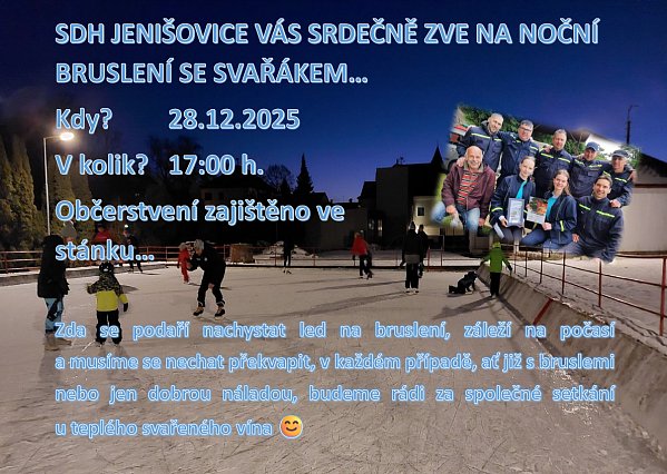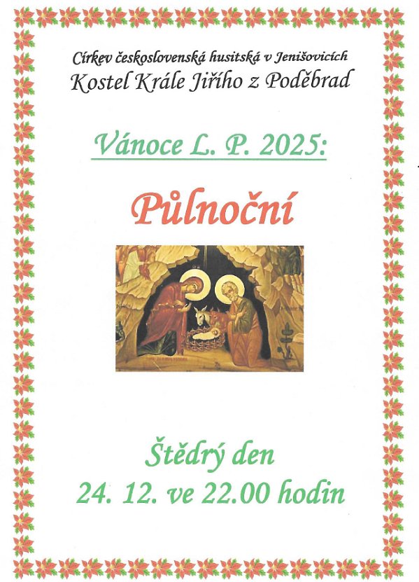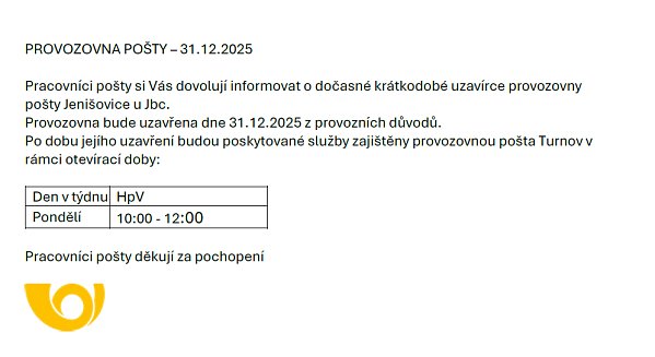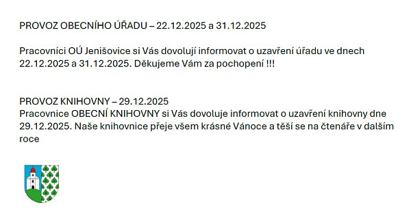DOVOLUJEME SI VÁM POPŘÁT KRÁSNÉ VÁNOCE A KLIDNÝ A POHODOVÝ VSTUP DO DALŠÍHO ROKU 2026, než se však s rokem 2025 rozloučíme, máme pro Vás naše poděkování, pozvánku na Půlnoční a pozvánku od SDH Jenišovice na setkání u svařáku, několik provozních informací a kalendář akcí na další rok... | | | | provoz pošty, úřadu a knihovny | |