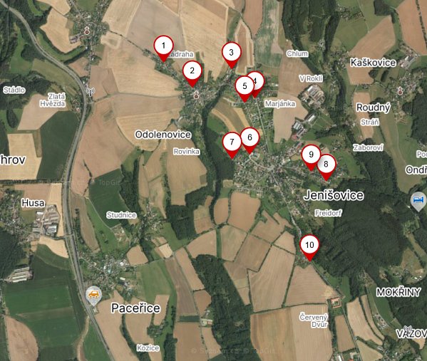 Místa označená v mapě - viz obrázek níže či dostupná kliknutím na zelené tlačítko.